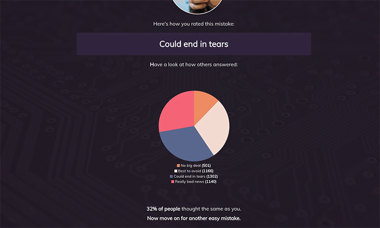 This compliance elearning example uses social learning to instigate behavior change. Learners are asked to judge real situations and use social polls to compare their views with their colleagues.